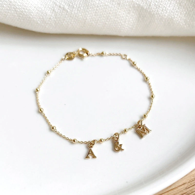 - Chaîne fine avec petites boules composée d’un ou de plusieurs pendentifs lettres (5mm) ou signe &, ou coeur, au choix.