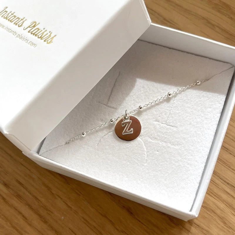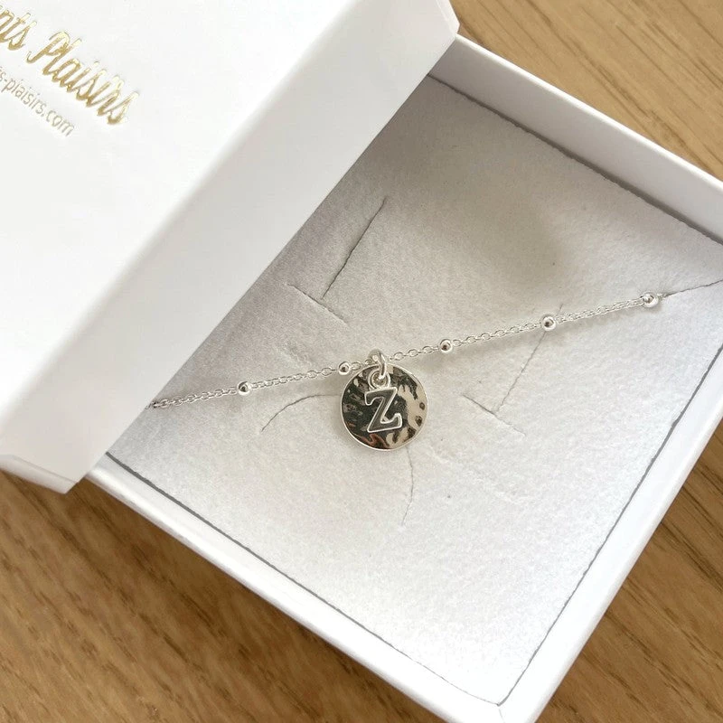 - Pendentif médaille lisse ou martelée 10mm + initiale (5mm) au choix montés sur une chaîne boules