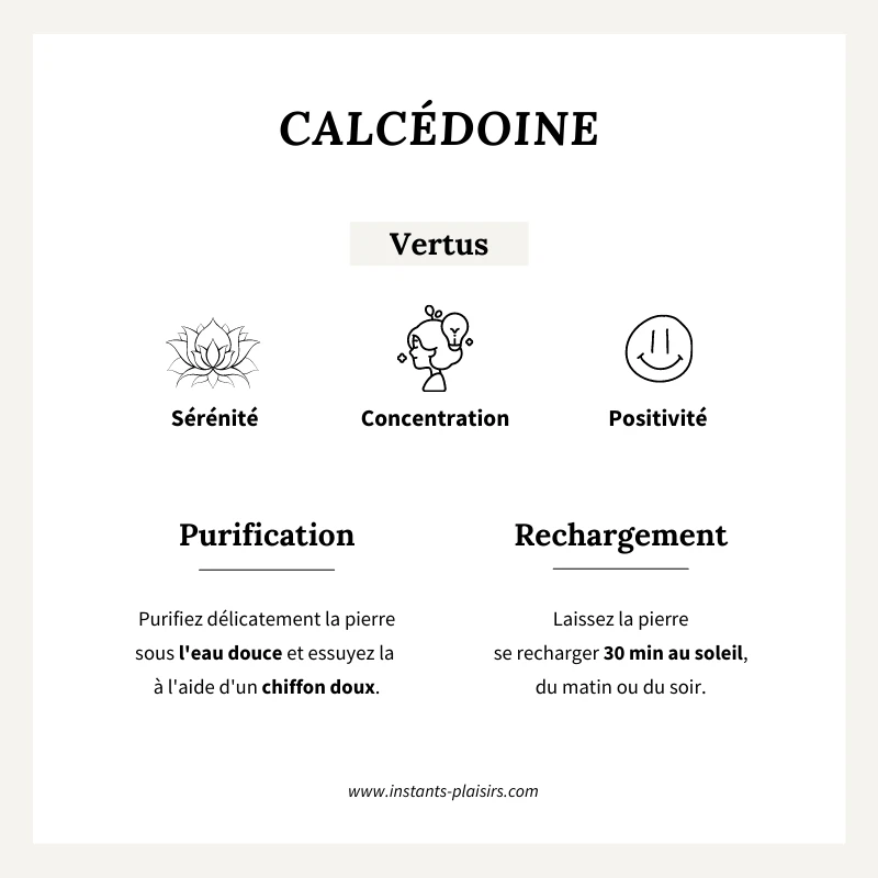 SERENITE : La Calcédoine est une pierre positive et propage des émotions paisibles. Elle favorise l’apprentissage, en apportantune meilleure compréhension et concentration.