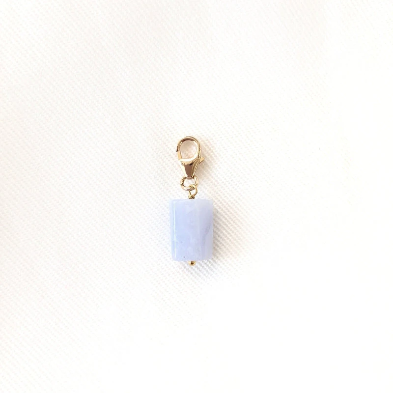 - Pendentif créé à la main dans notre atelier en Bretagne composé d’une pierre semi-précieuse appelée « Calcédoine » tube (1,1×0,7cm) montée sur un fermoir mousqueton