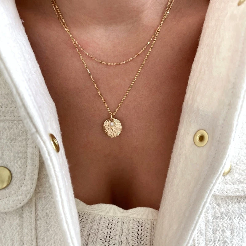 - Avec un pendentif médaille martelée ondulée (diamètre : 1,5cm) ornée d’une perle d’eau douce, montés sur une chaîne fine