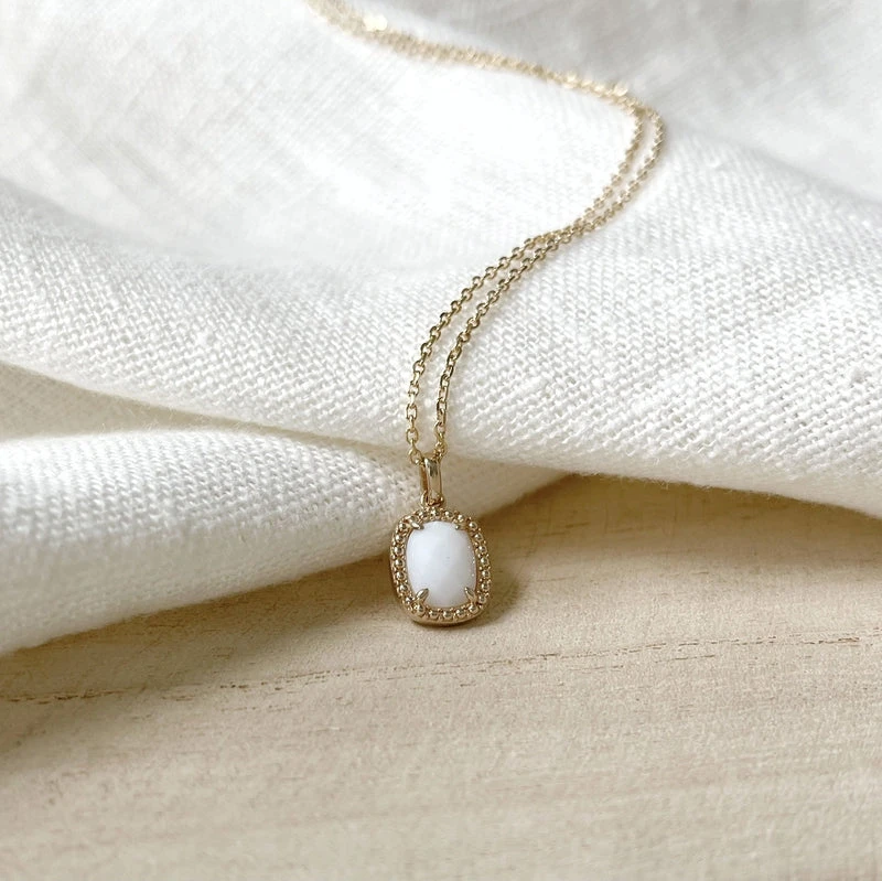 - Pendentif blanc facetté orné d’un contour mini billes (diamètre : 1×1,2cm) monté sur une chaîne fine