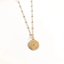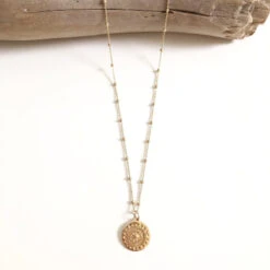 - Médaille avec motif aztèque (diamètre : 1,5cm) montée sur une chaîne fine composée de petites boules