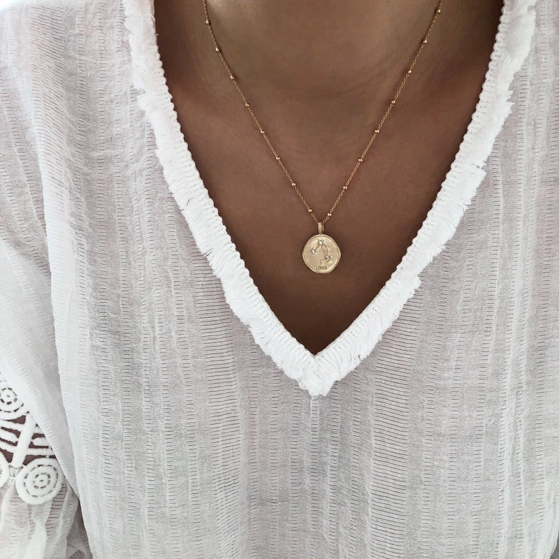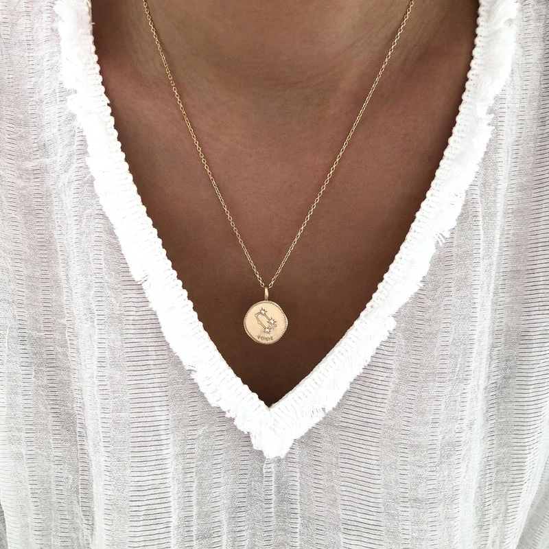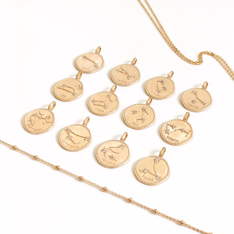 - Avec pendentif médaille motif constellation signe astro du zodiaque serti d’oxydes de zirconium & monté sur une chaîne simple ou avec boules (au choix)
