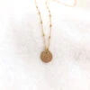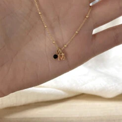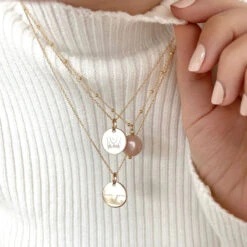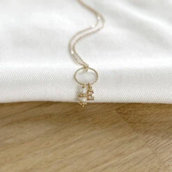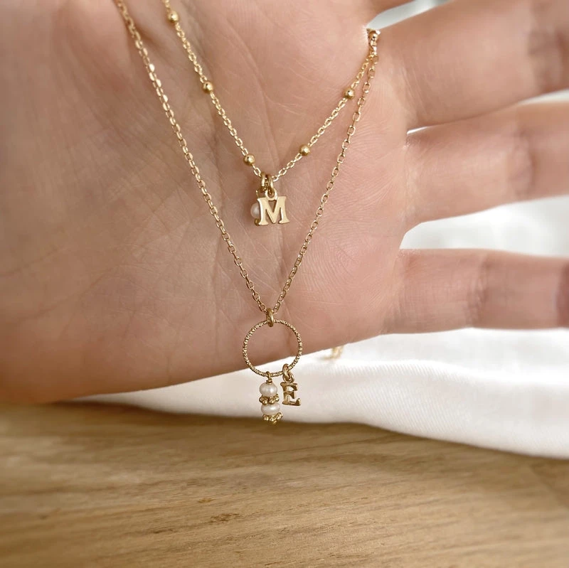 - Avec un pendentif composé d’un cercle facetté (10mm), de perles d’eau douce, de petites fleurs dorées et d’un pendentif lettre au choix (5mm), montés sur une chaîne fine