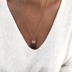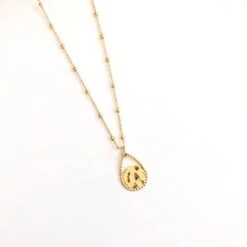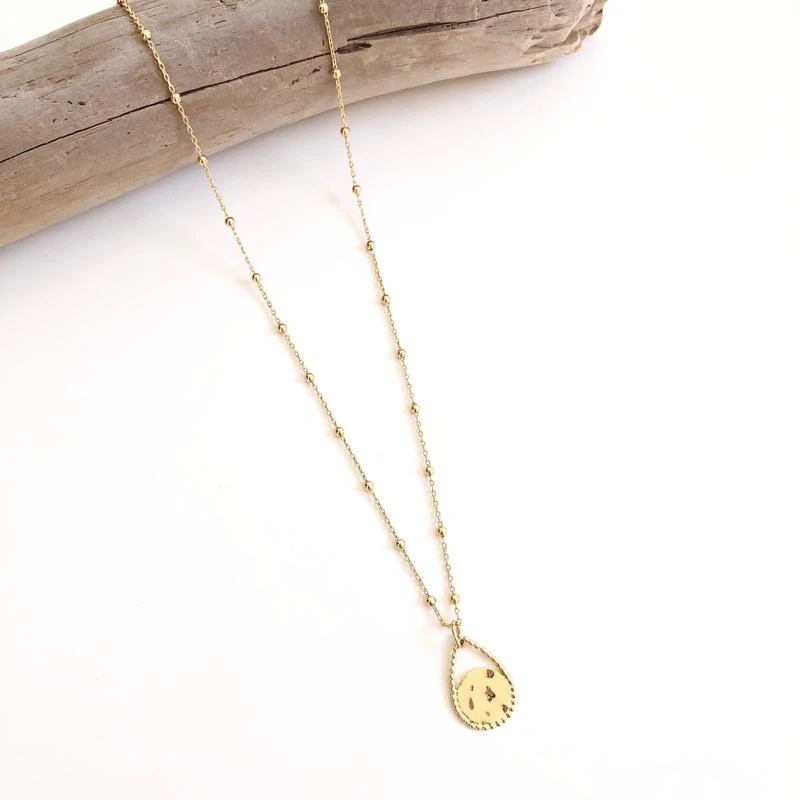 - Pendentif goutte, contour boules avec médaille martelée (diamètre : 1,2×1,8cm) montée sur une chaîne fine composée de petites boules