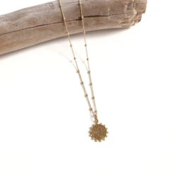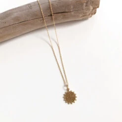 - Médaille motif soleil (diamètre : 1,5cm) montée sur une chaîne fine ou boules, au choix