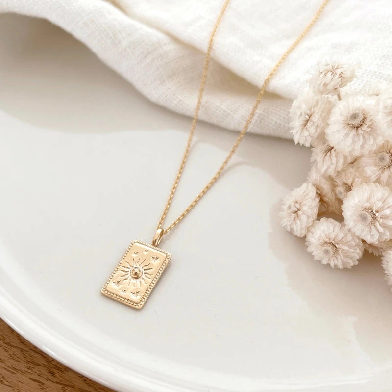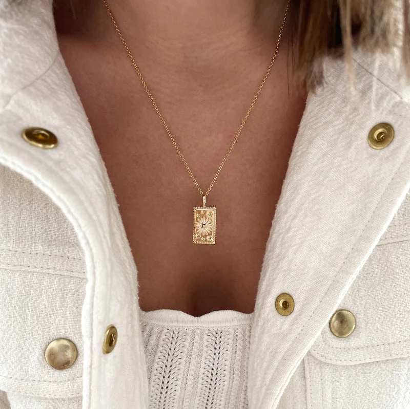 - Médaille carte tarot motif soleil et étoiles (diamètre : 1,9 x1,1cm) montée sur une chaîne fine