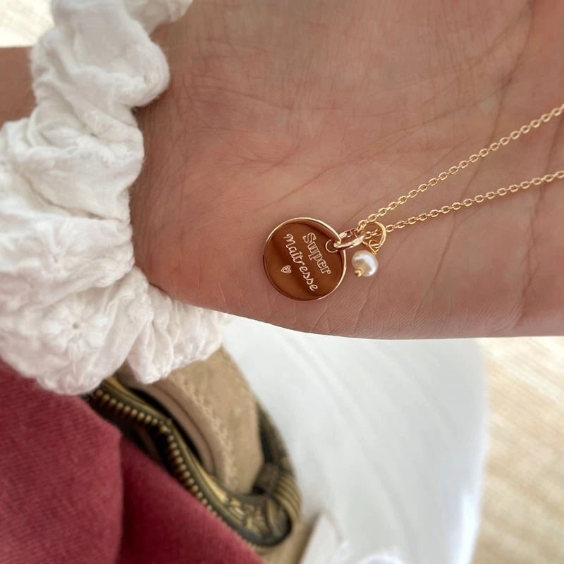 - Médaille lisse (diamètre : 1,5cm) et petite perle d’eau douce montées sur une chaîne fine
