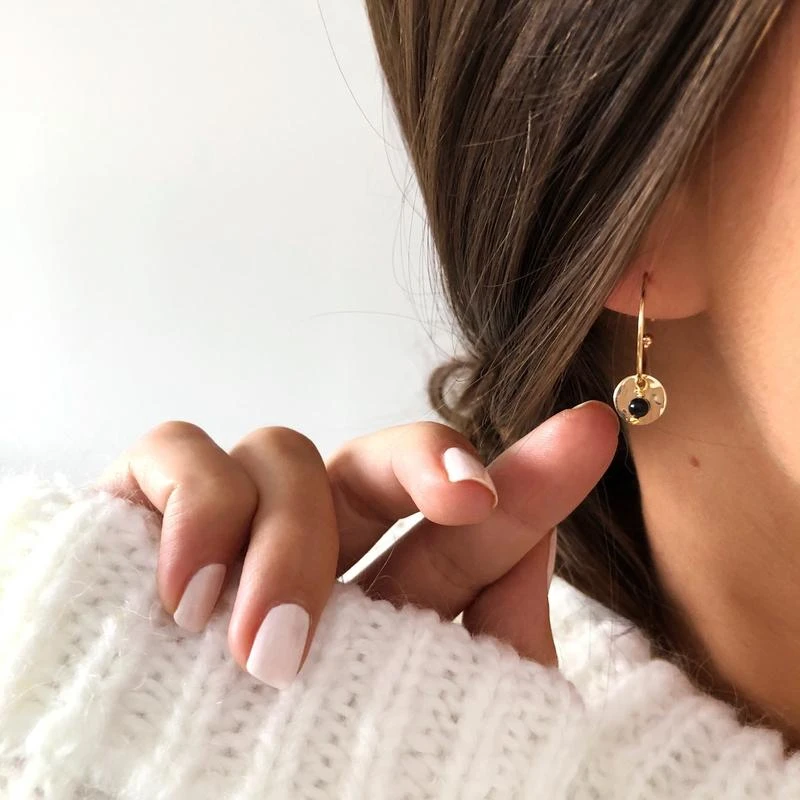 - Créoles à enfiler, composées d’une médaille martelée (0,8cm) & d’une pierre onyx noire pendante