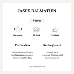 HARMONIE : Cette pierre tachetée est connue pour créer l’équilibre du yin et yang. Elle aide à traverser avec calme les épreuves et les changements. Elle favorise la réflexion et aide aux prises de décision. Elle chasse les ondes négatives pour faire naître des sentiments plus positifs tels que la sérénité, l’harmonie et l’épanouissement. Enfin, elle stimule l’imagination et la créativité.