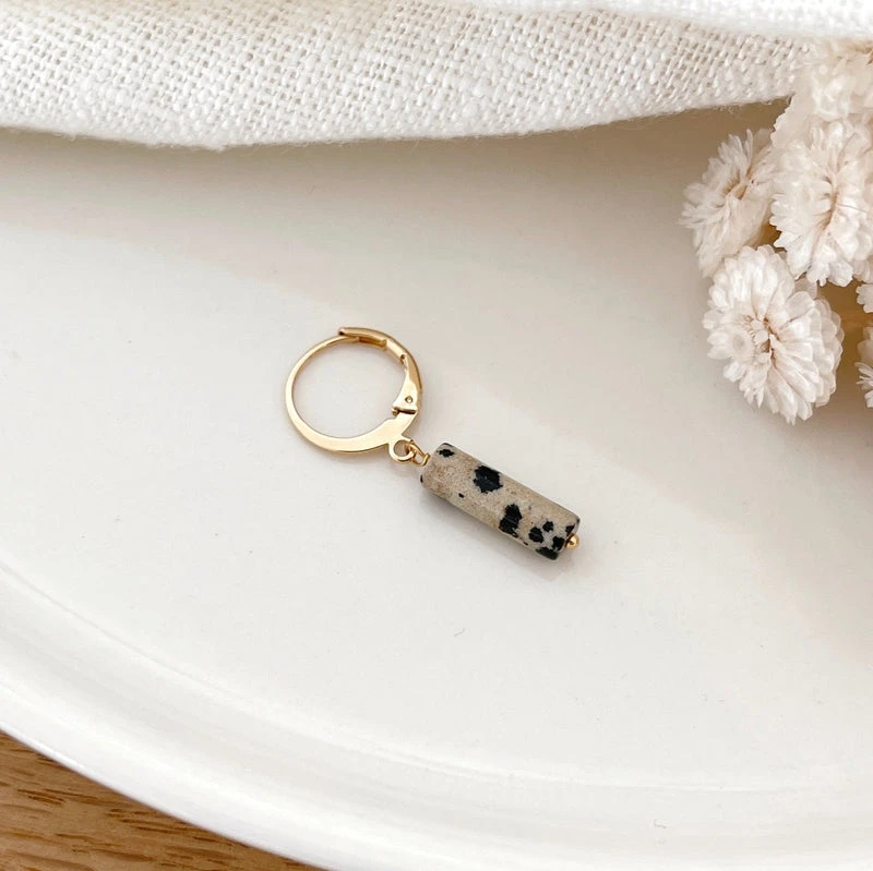 - Ornée d’une pierre naturelle semi-précieuse tube appelée « Jaspe Dalmatien » (1,4×0,4cm)