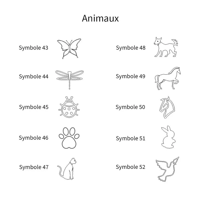 - Possibilité de graver une phrase, un prénom, un mot, une date, un symbole (coeur, double coeur, lune, étoile, petite fleur, trèfle, croix, symbole signe astrologique…)