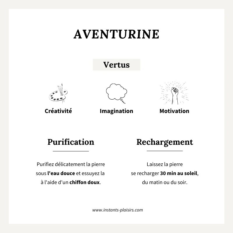 CREATIVITE : Cette pierre verte possède des bienfaits sur la créativité et l’imagination. Parmi ses vertus, on retrouve également une action motrice sur le développement de soi pour mieux se connaître. Elle motive, apporte une liberté d’action et de réflexion ainsi que des propriétés de protection.